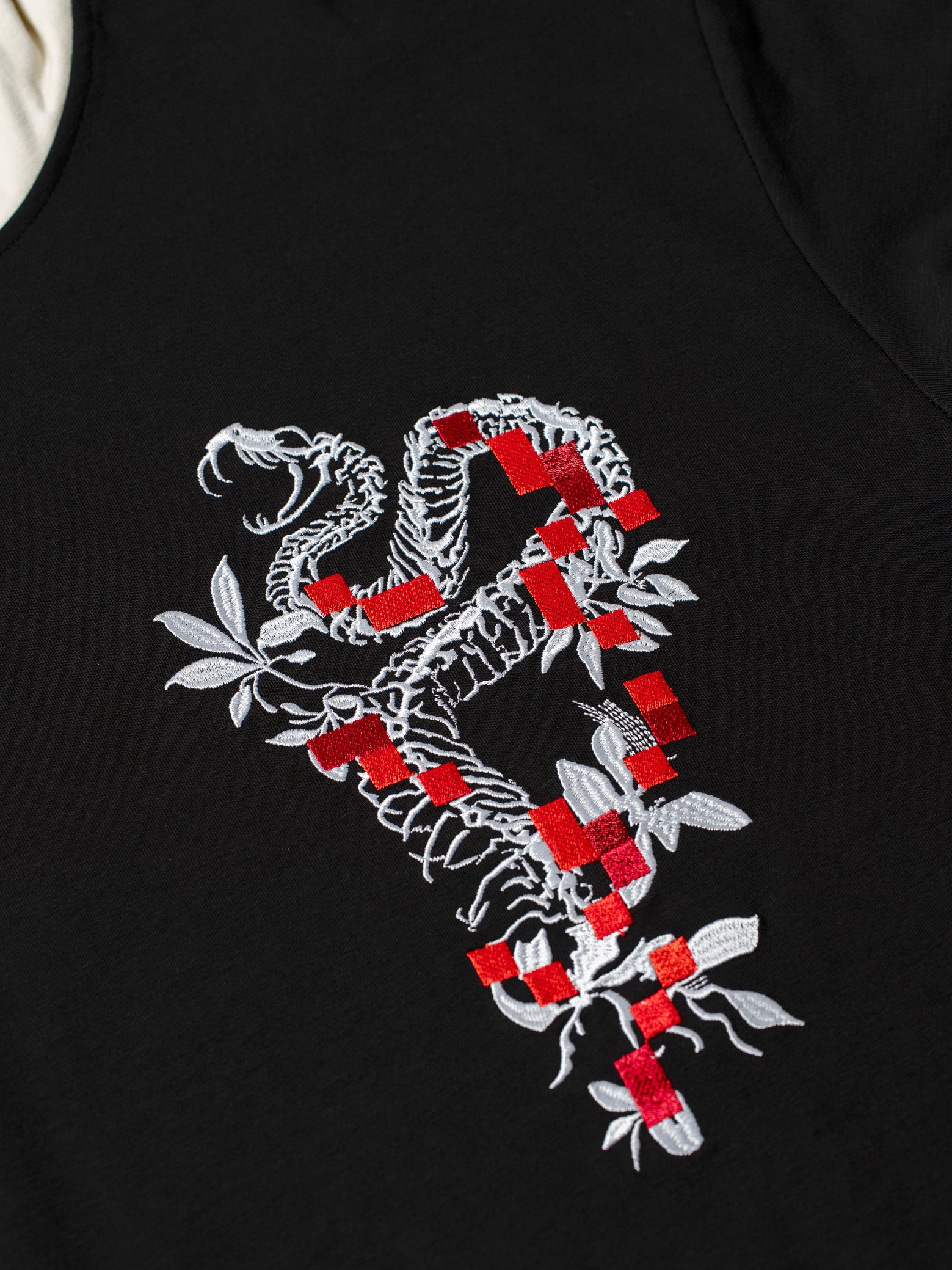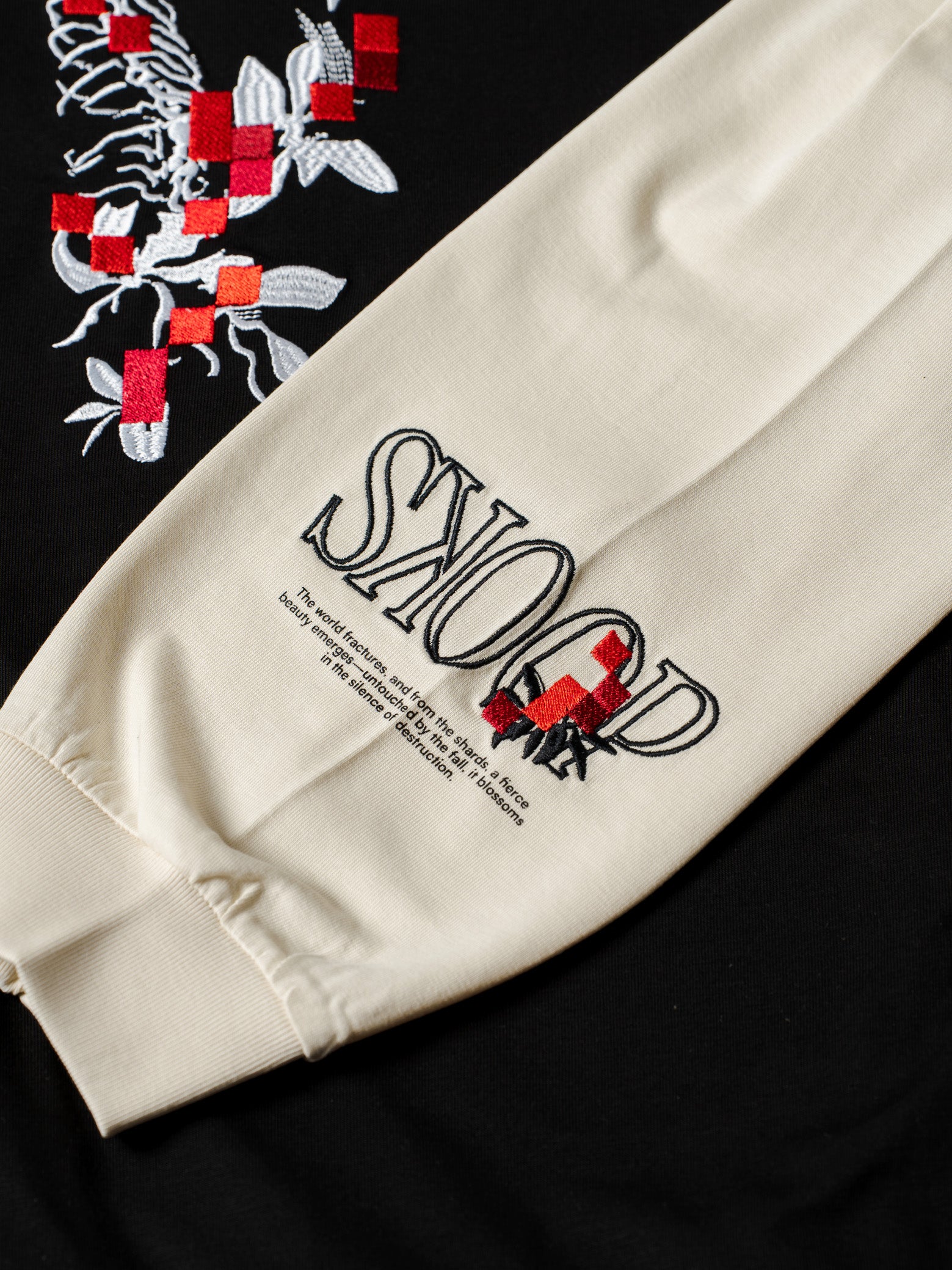 SKU Description: Shirt-layered hoodie with inner hood and sleeves, featuring silkscreen and embroidered graphics on the front, back, and sleeves.