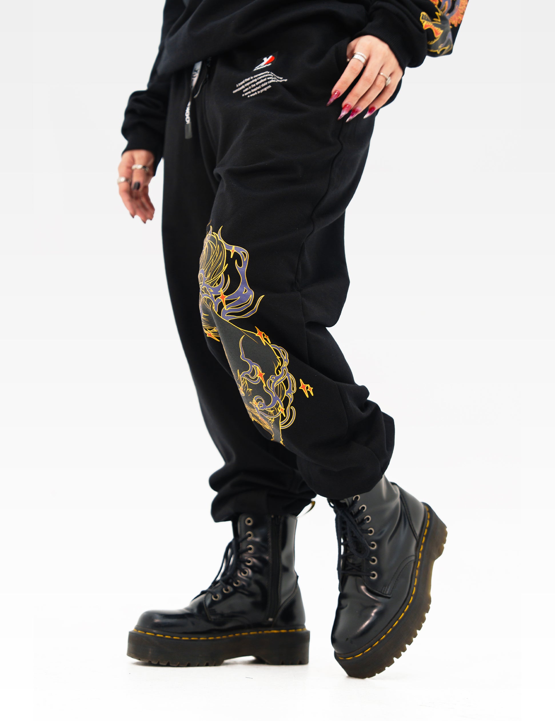 Description: Silk screen printed sweatpants on the front and back with embroidered woven patch (inverted K)